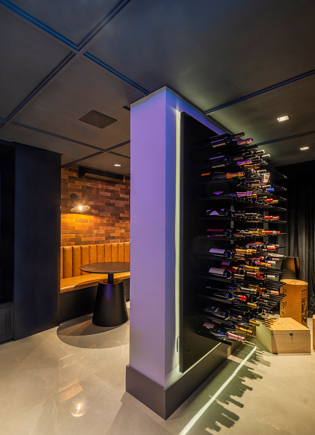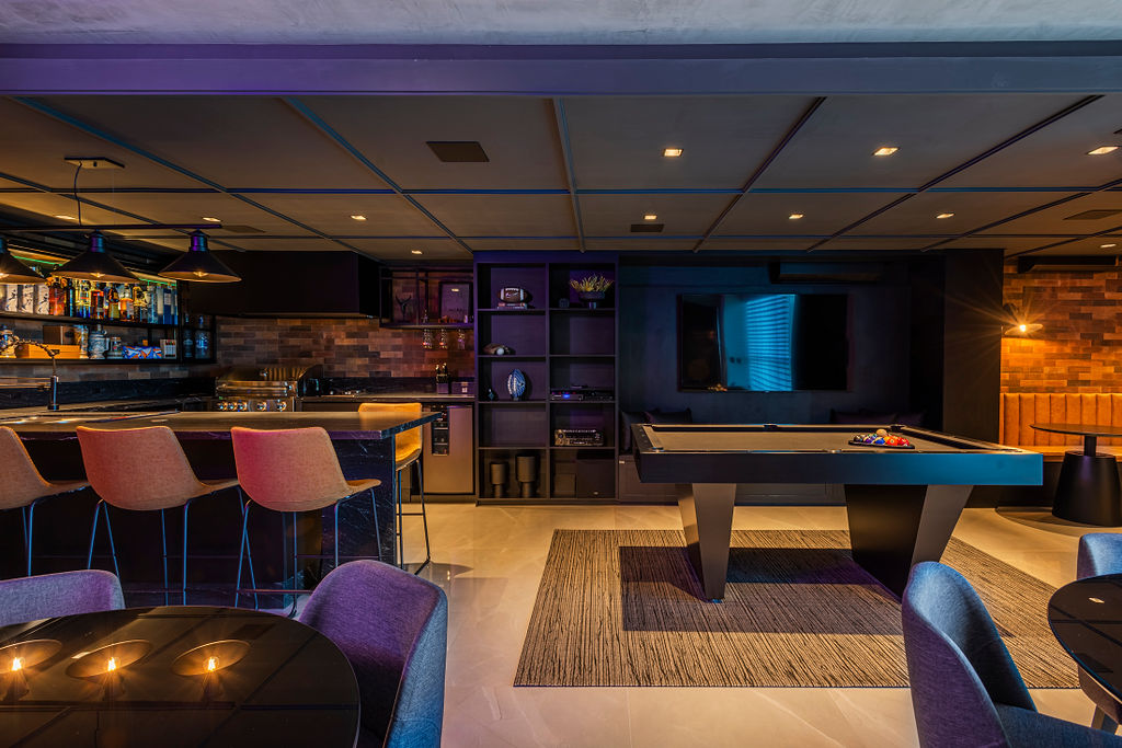 Um dos diferenciais deste apartamento é ter um espaço além do living para receber. “Partimos da premissa de criar um ambiente mais escuro, descolado e marcante, que tivesse a possiblidade de ser integrado ao living, e ainda assim seguir o conceito de todo projeto. O pub gourmet é aquele sonho de consumo que todos gostariam de ter em casa, com direito a adega para mais de 100 vinhos, mesa de sinuca, e uma ilha com churrasqueira a gás”, pontuaram.