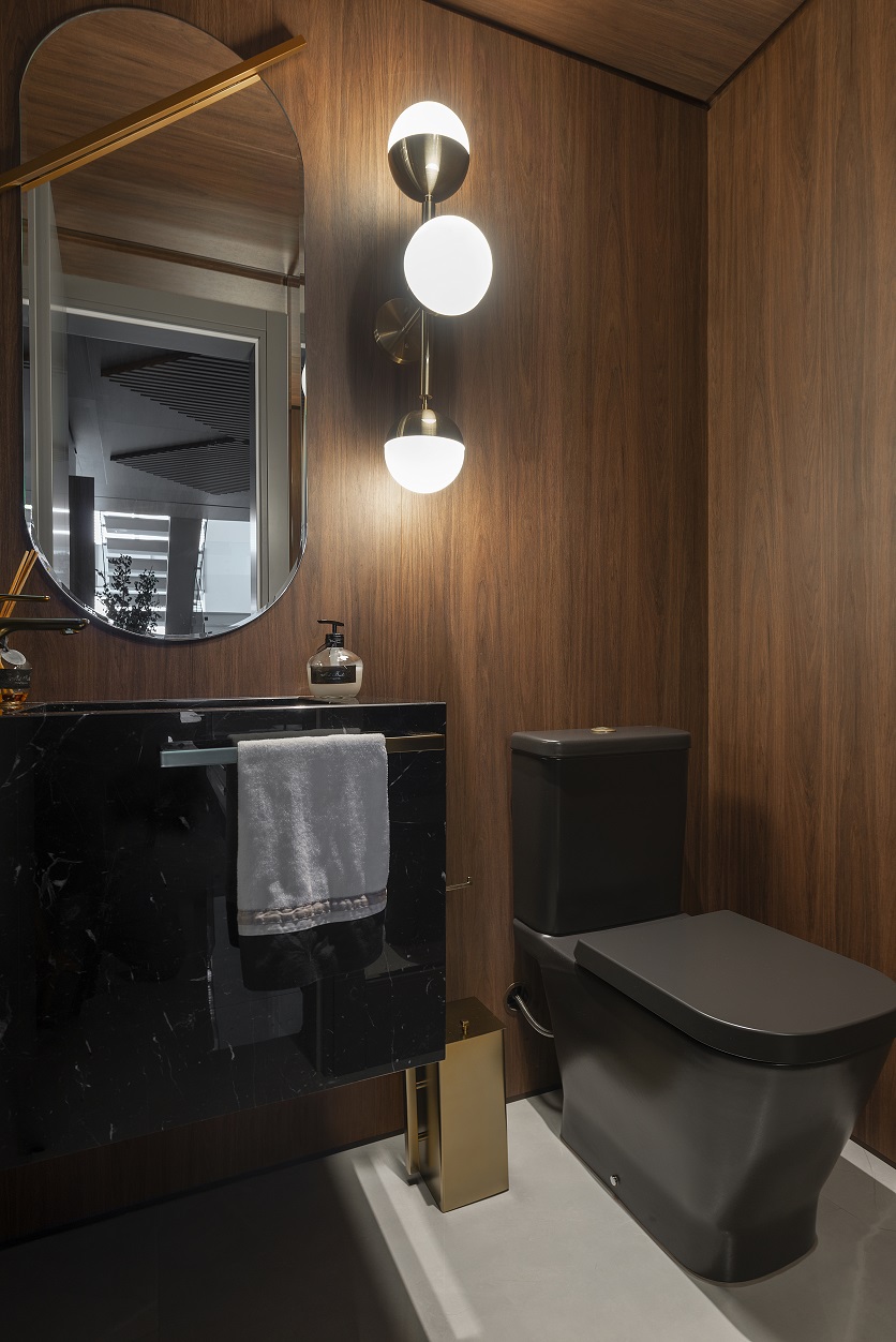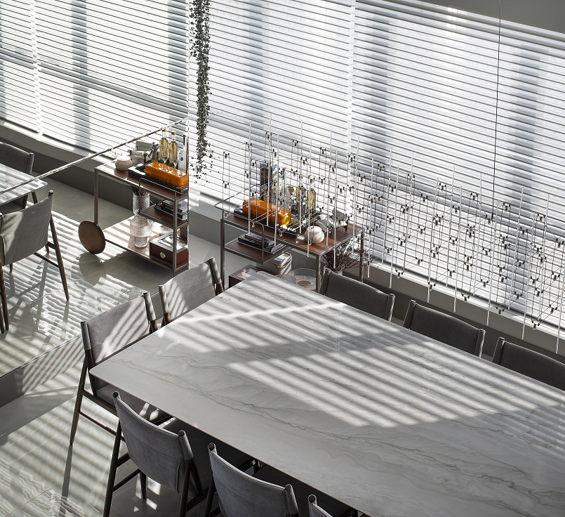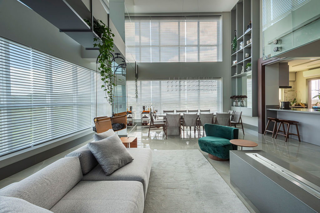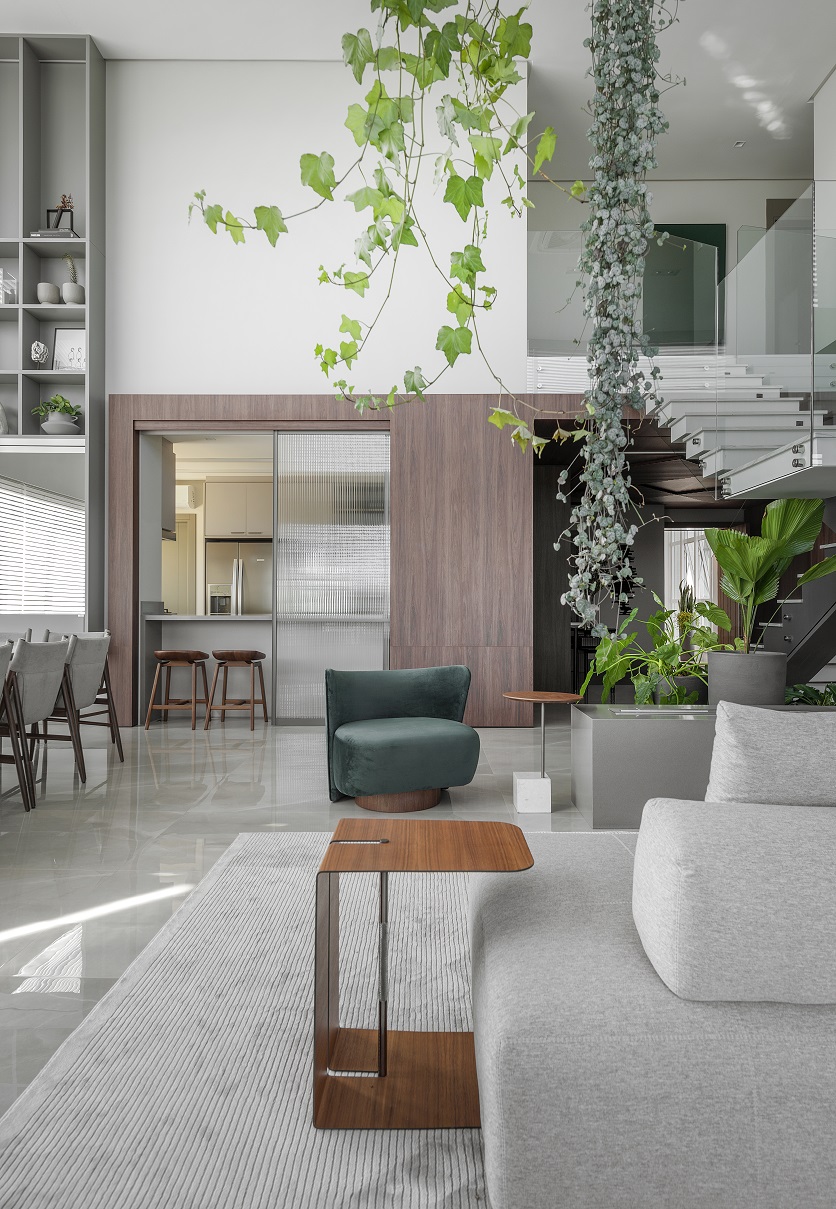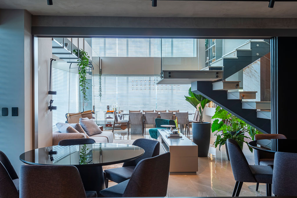 “Tanto na área social, quanto íntima utilizamos revestimentos nobres, como porcelanatos em grandes formatos, mármores, presente na mesa de jantar e também na escada, madeira no hall de entrada e laca na estante do pé direito duplo. O vidro canelado das portas deslizantes e cristaleira na cozinha, também foi um material essencial para nós neste projeto. No mobiliário solto temos um mix de texturas, como o veludo da poltrona em destaque, o couro no balanço sela e o linho nas cadeiras da mesa de jantar”, explicou Eluize. Além disso o apartamento é todo automatizado.