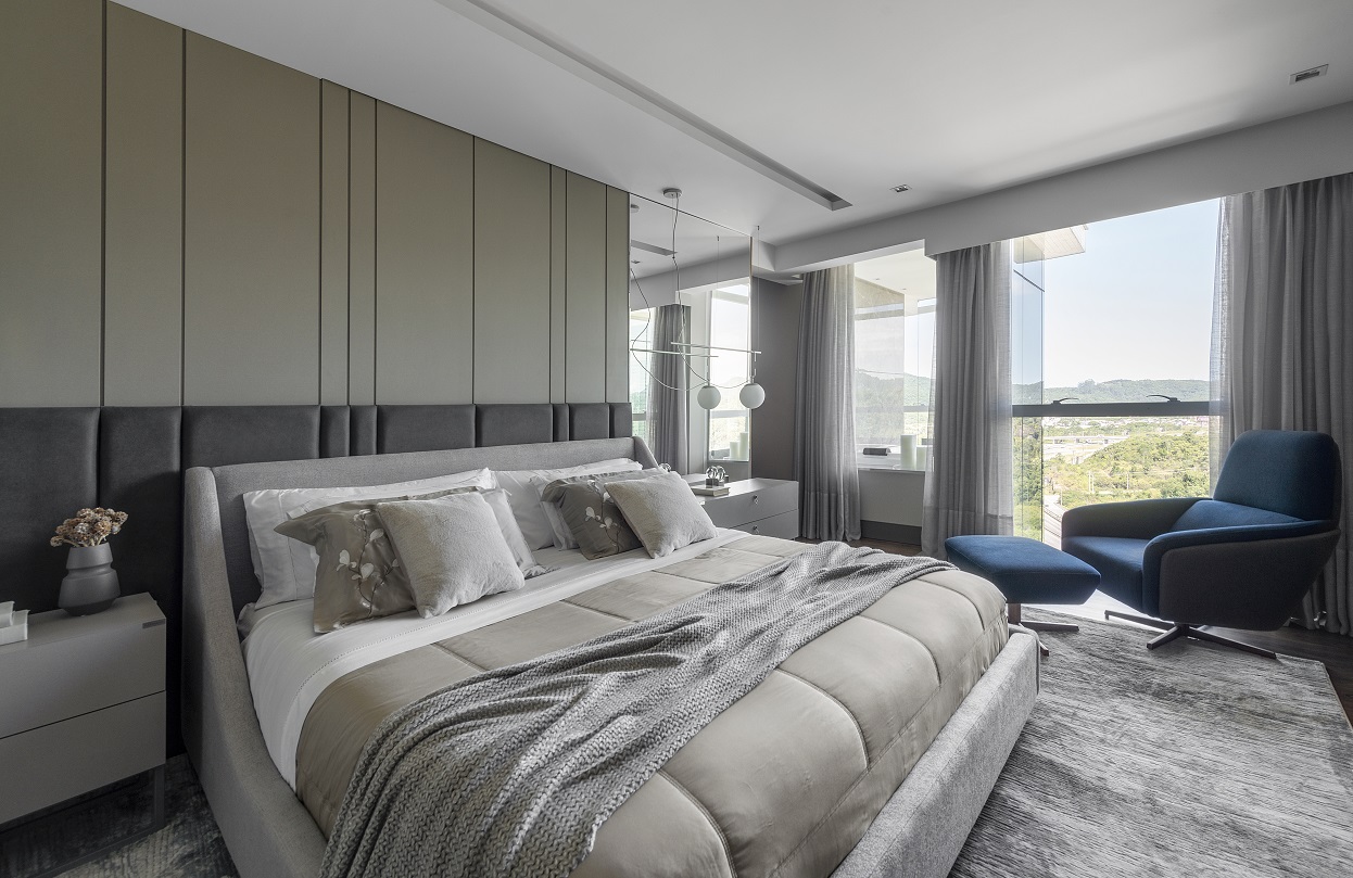 No andar superior, a suíte master segue a mesma linguagem do restante do apartamento, com cores neutras e uma estética leve e descomplicada. Minuciosamente pensada para que sua funcionalidade fosse aliada ao conceito adotado para o projeto do apartamento todo, a área de banho se integra ao quarto e ao mesmo tempo proporciona a contemplação da vista.