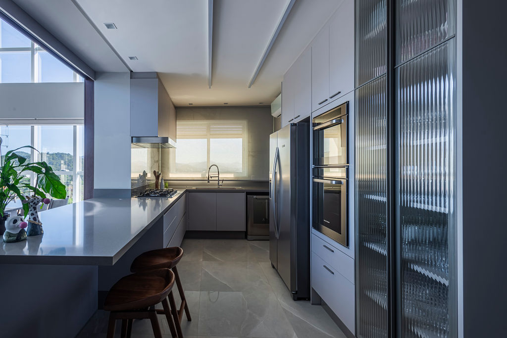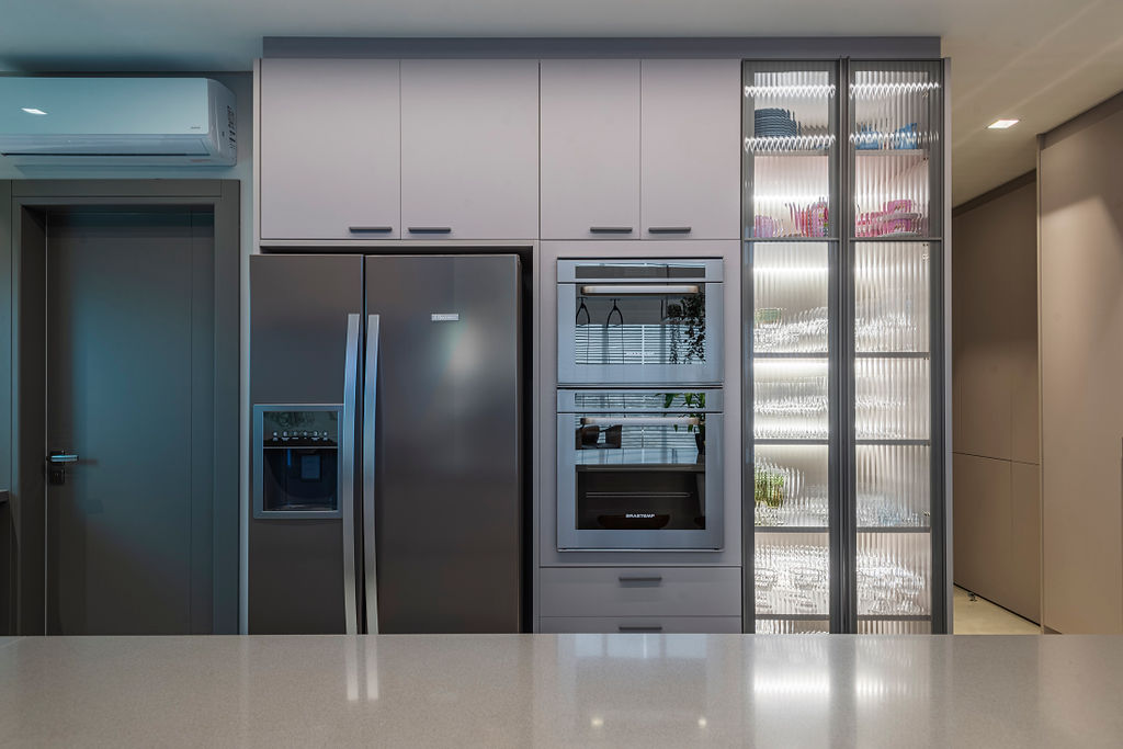 Cozinha: Possibilidade de ser integrada através de portas deslizantes em vidro canelado, mas ao mesmo tempo privada. A proposta foi criar uma cozinha prática para o dia a dia. Cores neutras e detalhes pensados para funcionalidade.