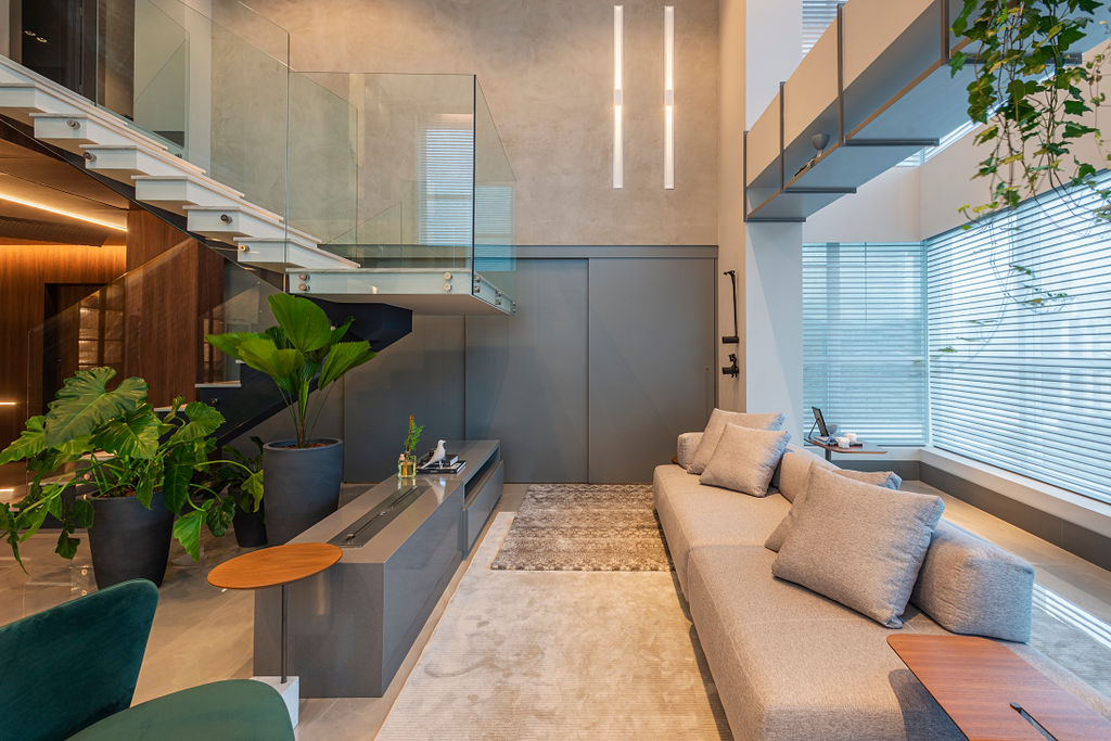 Cosmopolita e contemporâneo, o projeto segue uma paleta sóbria, onde as texturas e os acabamentos trazem sofisticação. O hall de entrada marcante e imponente é todo revestido em madeira, um espaço intimista, que ao fundo revela um living amplo, com pé direito duplo e muita luz natural.