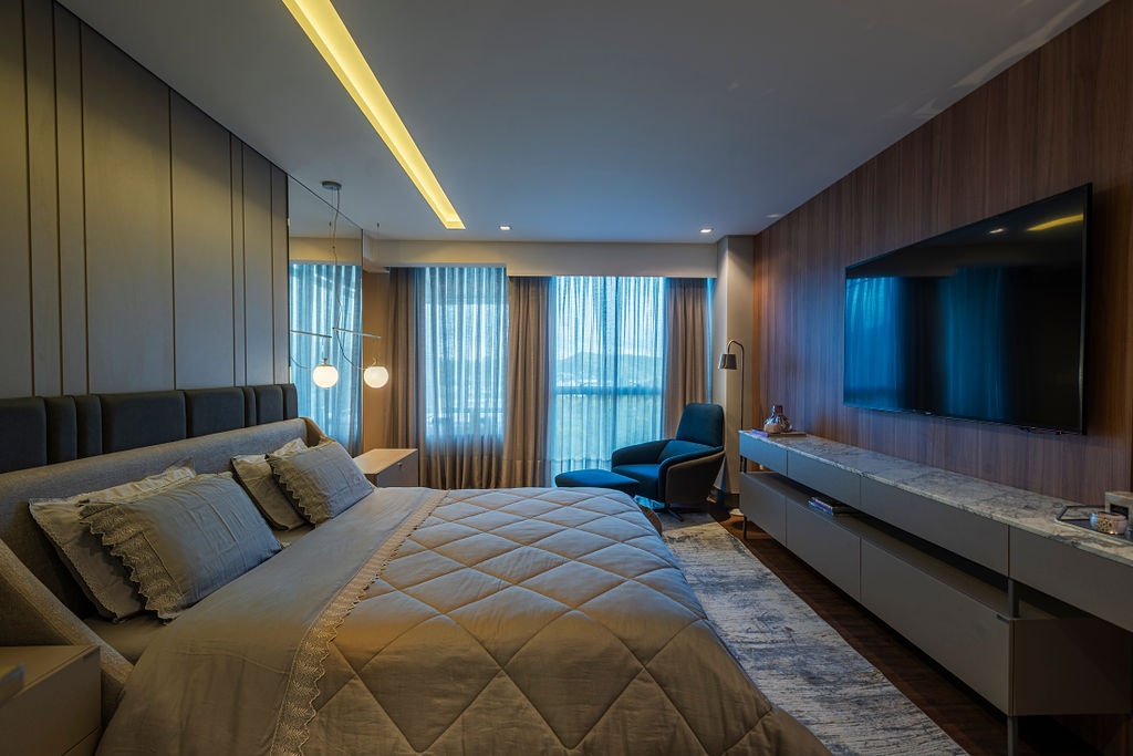 Suíte master: Uma ampla suíte com closet e área de banho. A paleta de cores é neutra e o conceito foi criar um espaço suave, delicado, acolhedor e atemporal.