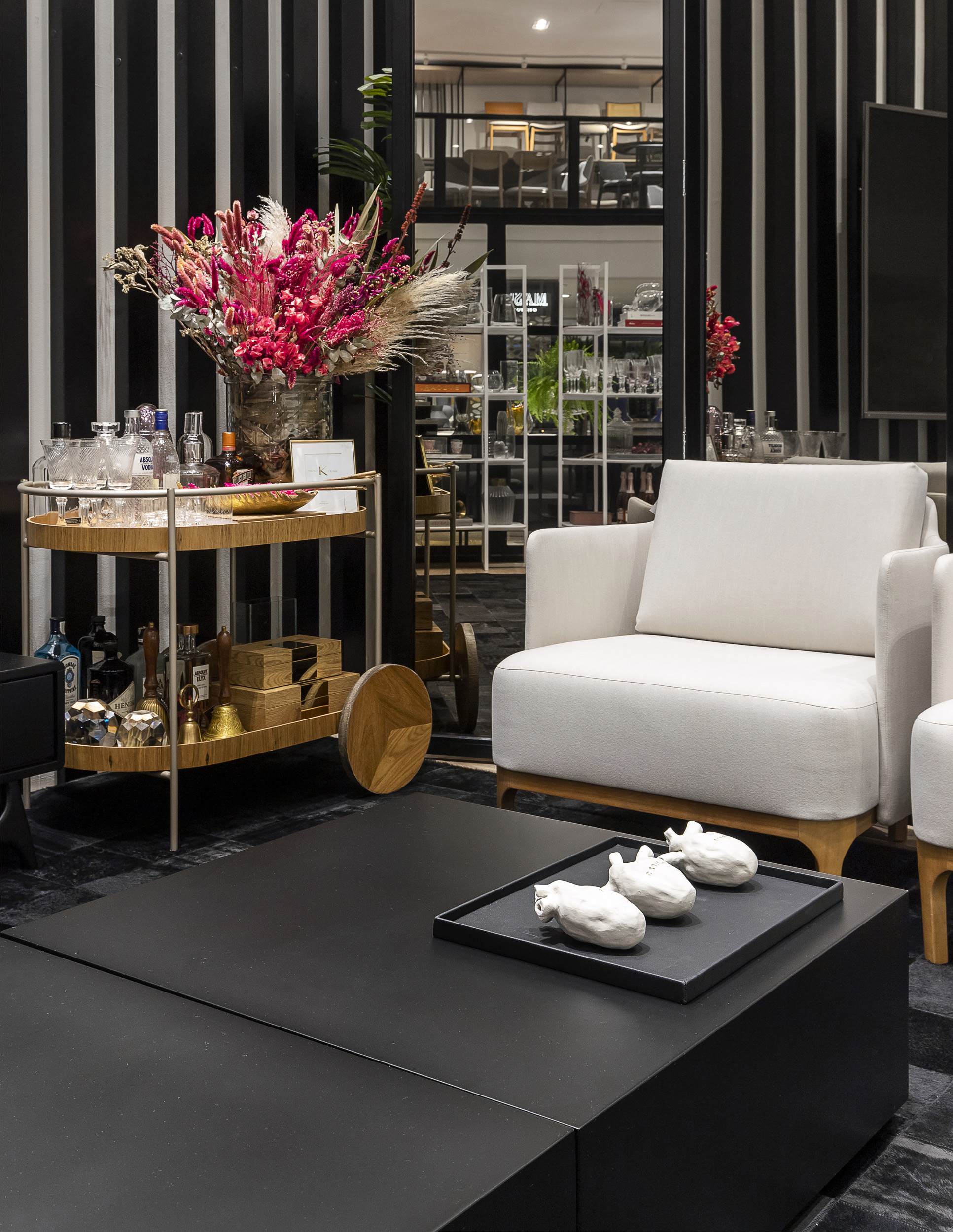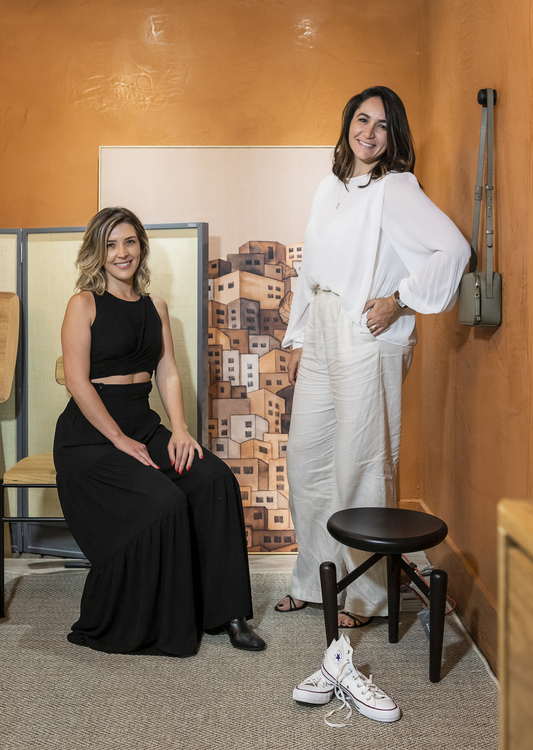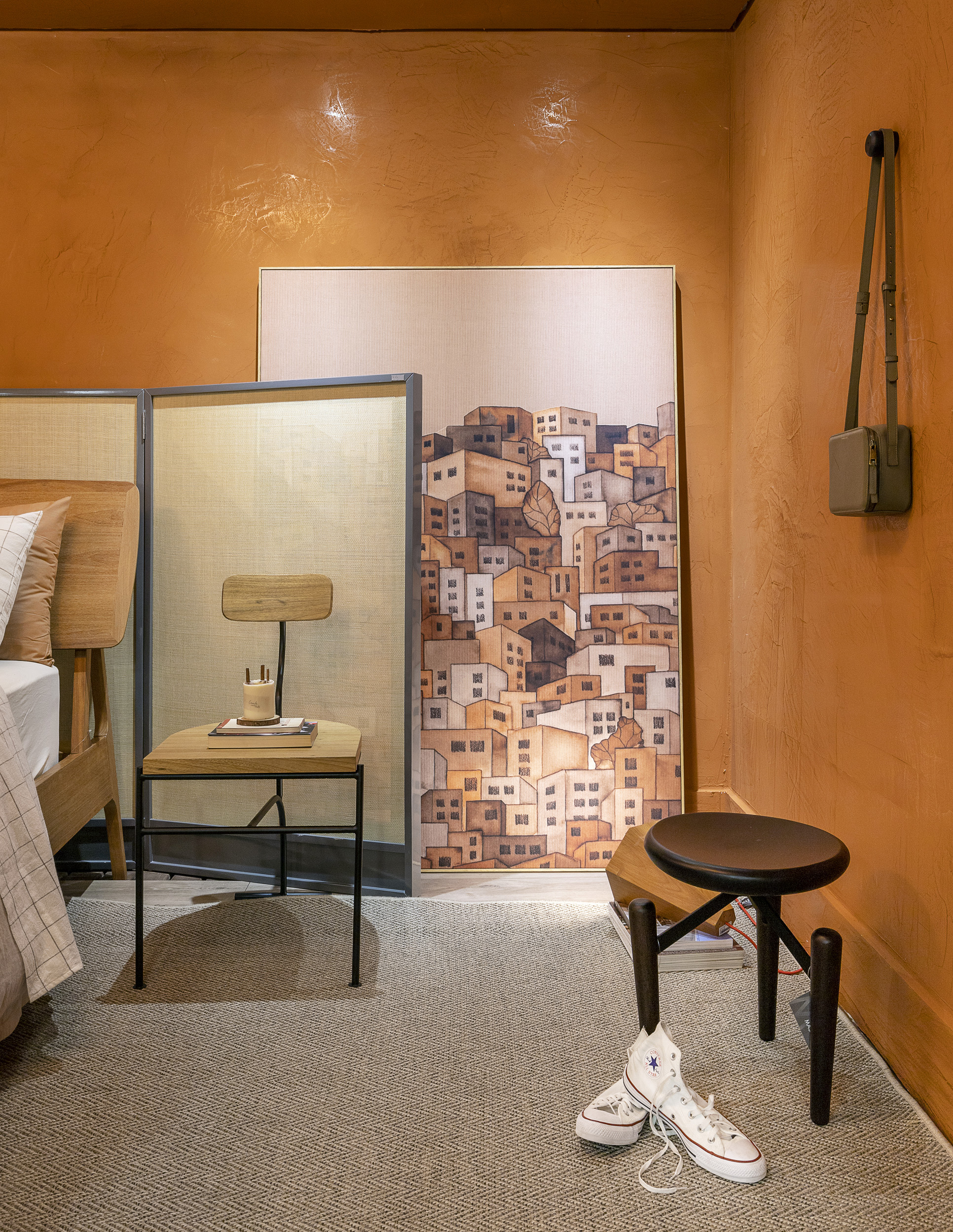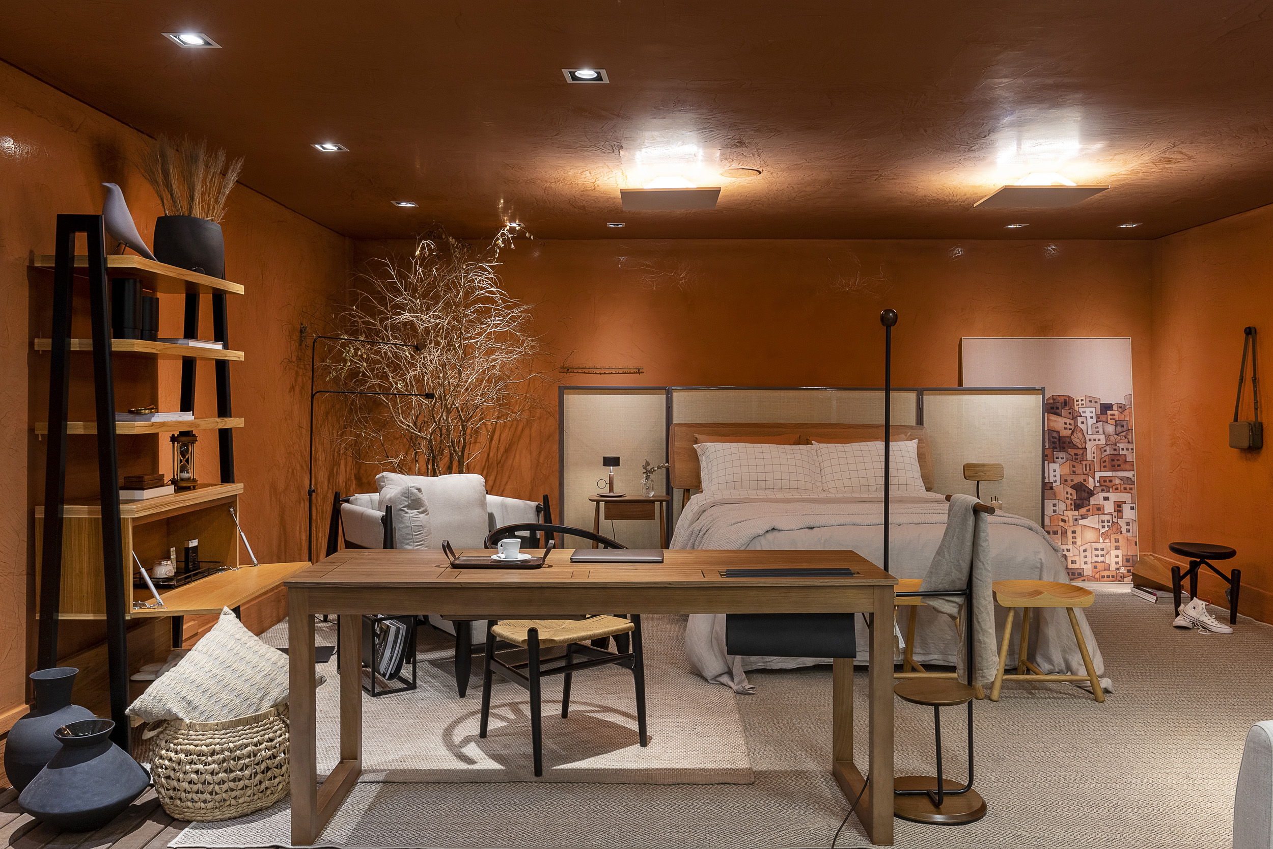 O espaço exibe vários itens de design, mas todos funcionais. “Para projetar, a gente tenta se imaginar utilizando o lugar: desde colocar um banco que tenha serventia, que possa ser usado para sentar ou trocar um sapato, ou uma mesa para trabalhar ou parar e tomar um chá”, define Andressa. Na exposição, há objetos pessoais que humanizam o ambiente, que tem a proposta de ser um refúgio, porém não como peça da casa esquecida, usada só na hora de dormir. Ouse, M.Martan Iguatemi, Izidio Neckel Pinturas estão com Andressa no espaço.