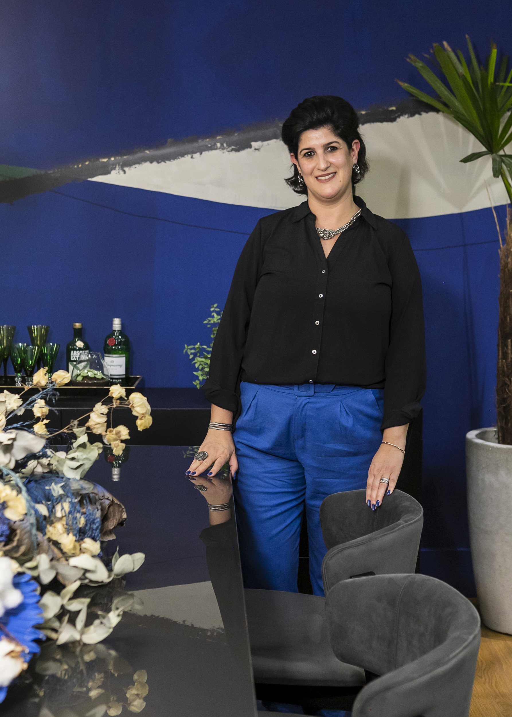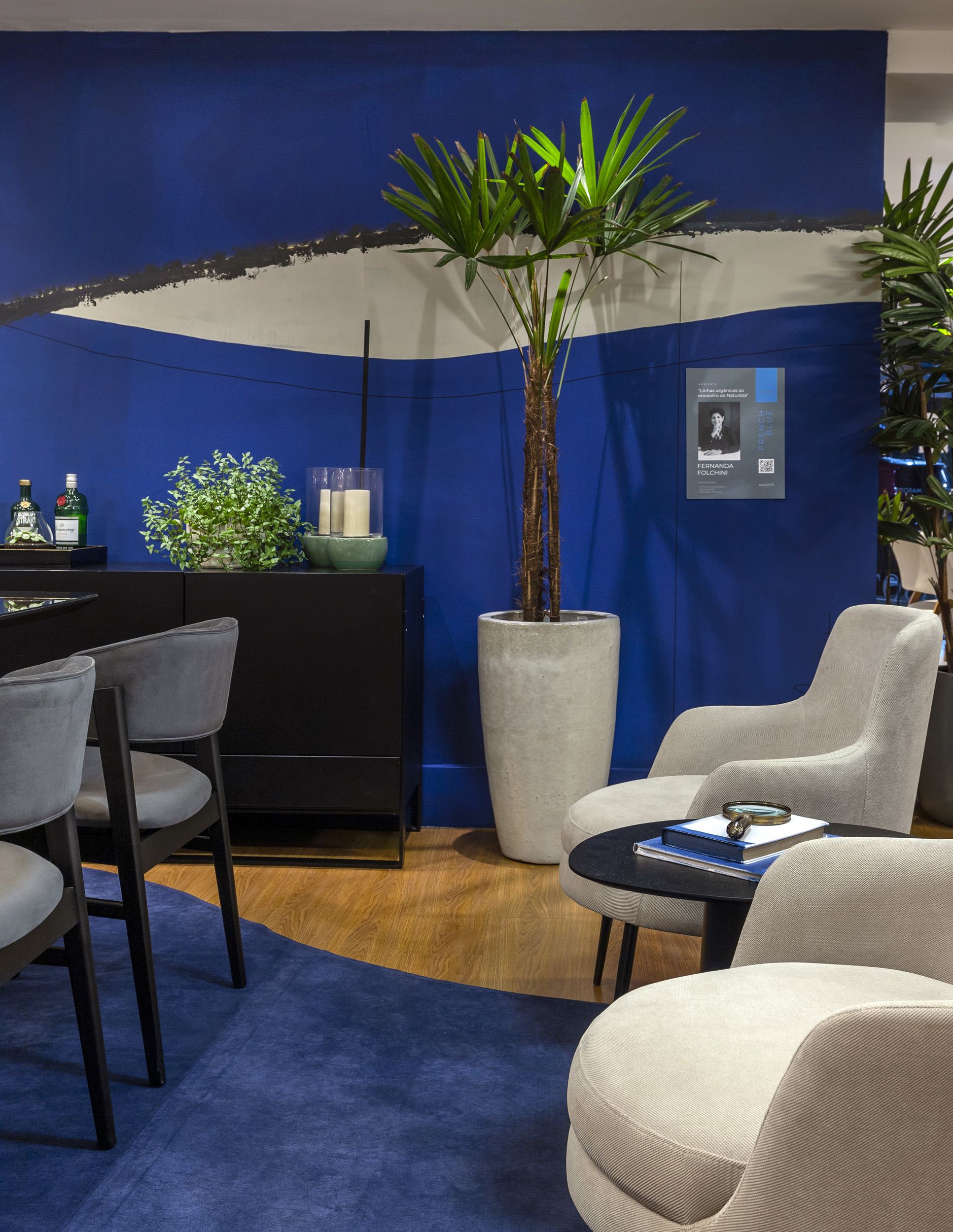 O French Blue orientou a sala de jantar da arquiteta Fernanda Folchini. No azul do elemento mar, no verde da vegetação e no branco das nuvens, cabem a calma e tranquilidade para uma boa refeição em família, na proposta da arquiteta. A obra de Camila Saavedra toma a parede no azul reconfortante, combinando com o arranjo sobre a mesa e o tapete em linhas orgânicas. Cia das Flores e Energiluz somam ao ambiente.