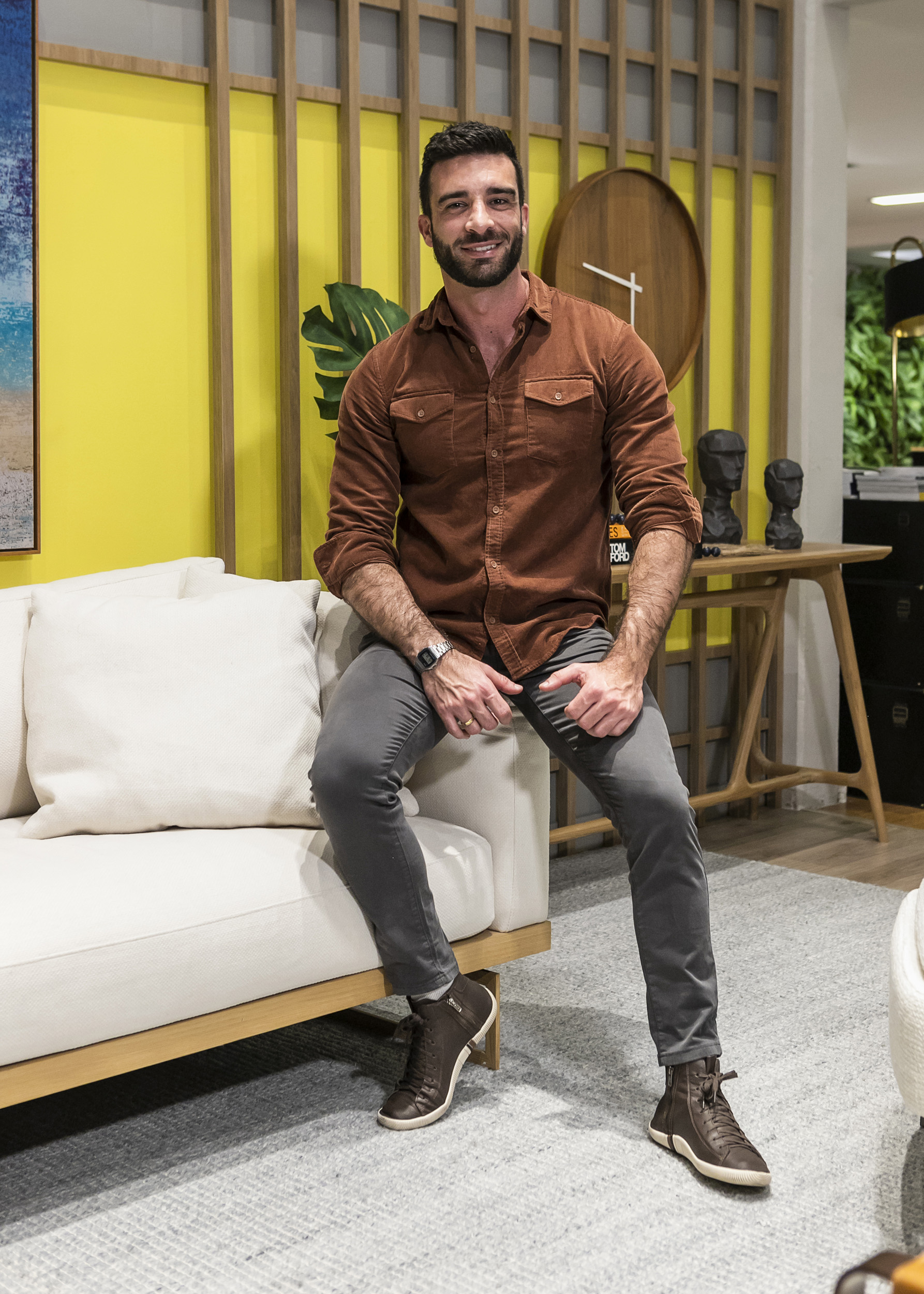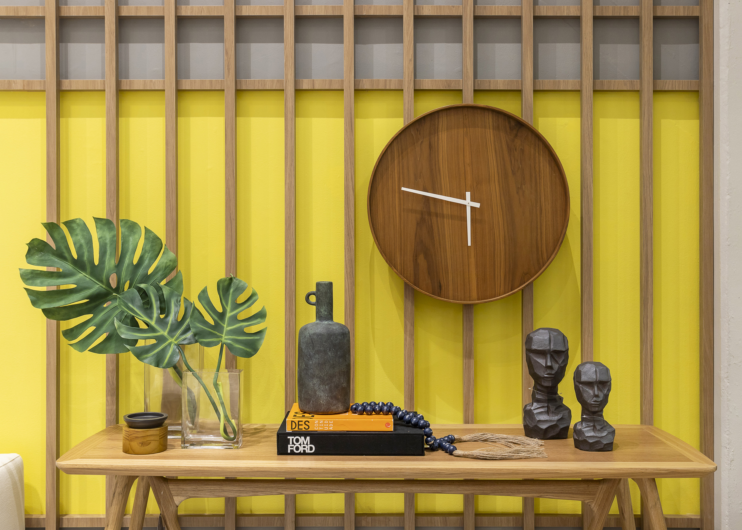 O arquiteto Thiago Patrício ficou com a cor Illuminating, um amarelo luminoso, para a sala de estar. Ele apresenta um layout bastante despojado, com destaque para o painel ripado, executado pela JR Móveis, que ocupa toda a faixa central do ambiente com o fundo Illuminating e outras duas faixas no cinza Ultimate Gray, combinação sugerida pelo próprio Pantone. Do mobiliário Masotti, compôs com design mais brasileiro, como o aparador MN em estrutura de madeira, o sofá Daloa, com base suspensa do piso, e as poltronas Hart, que têm um aspecto industrial. No jogo de cores, a poltrona e pufe Drowse, destaque do espaço, foi feita sob encomenda em tecido azul, compondo com o amarelo iluminado.