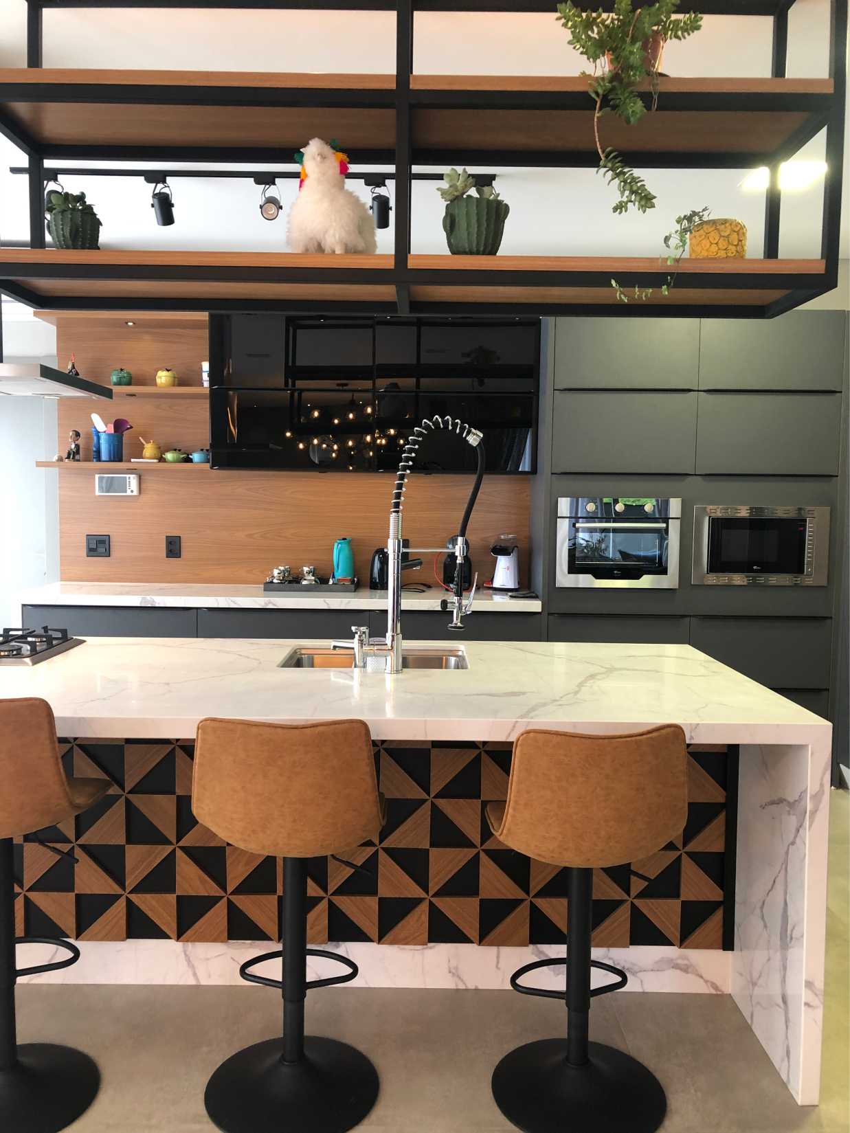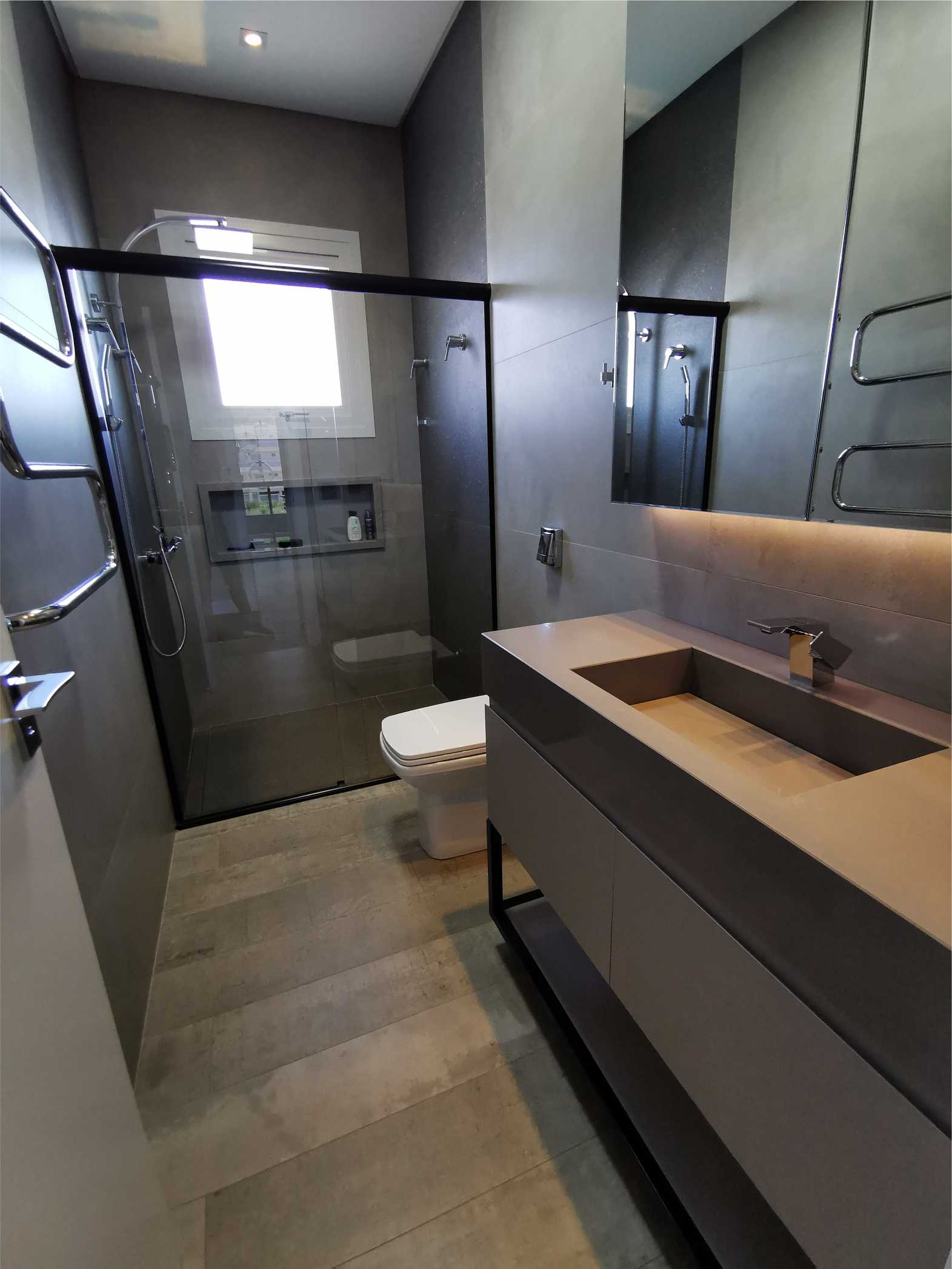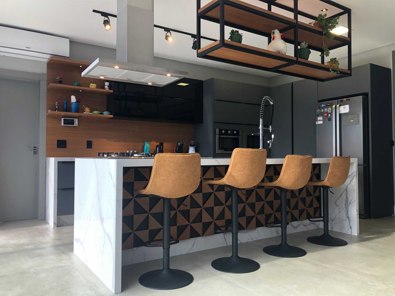 Entre as principais características estão os espaços amplos e integrados, com suas estruturas expostas em contraste com uma decoração atual e sofisticada. “Tentamos fugir de um projeto clean e arriscamos uma cartela de cinza e preto – quando muitos pensaram que ficaria estranho -, misturados com a madeira e concreto”, ressalta a arquiteta. E não é que a arrojada arquiteta conseguiu um resultado que surpreendeu? Confira as fotos do projeto: