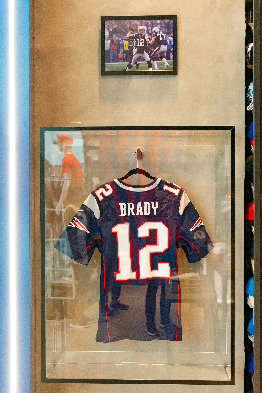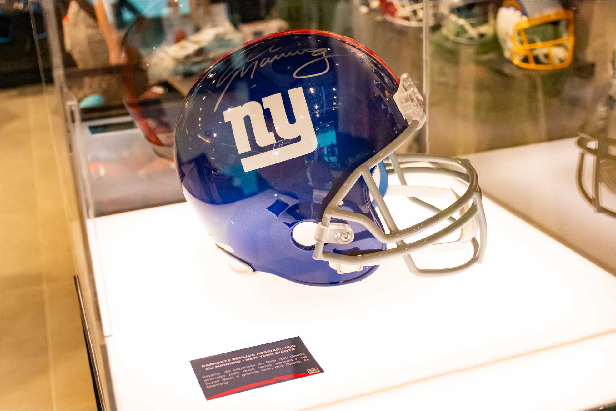 Ao caminhar pela loja, o fã logo encontra o capacete de Eli Manning, atleta dos Giants entre 2004 e 2019, Manning é famoso por ser o único quarterback a derrotar os Patriots, de Tom Brady, por duas vezes no Super Bowl (de 2007 e 2011), saindo como MVP da partida nas duas ocasiões.