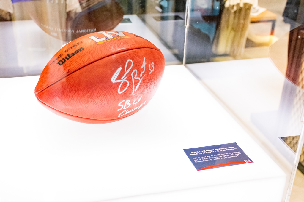 Destaque também para a "The Duke" oficial (bola de jogo da NFL) autografada pelo Linebacker Shaq Barret, que em fevereiro de 2021, após cinco temporadas e um título, conquistou seu segundo anel do Super Bowl ao vencer a edição 55 da competição. E, claro, a réplica do troféu Vince Lombardi em tamanho original, entregue na disputa do Super Bowl XLIV, entre New Orleans Saints e Indianapolis Colts, no dia 7 de fevereiro de 2010, no Hard Rock Stadium, em Miami.