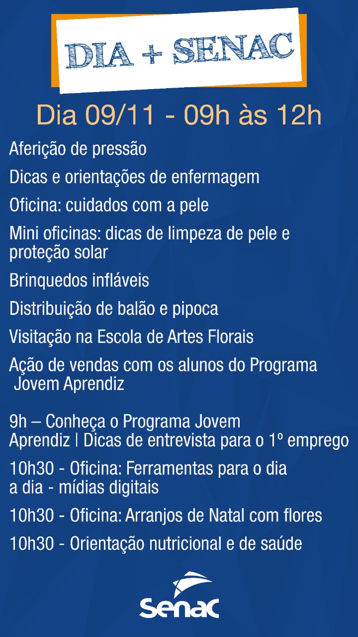 Na programação do Dia + Senac, destaque para a oficina de Arranjos de Natal com flores, que acontece a partir das 10h30. O workshop será ministrado por Jessica Campos, que neste ano participou da WorldSkiils - a maior competição profissional do mundo que aconteceu em Kazan, na Rússia.