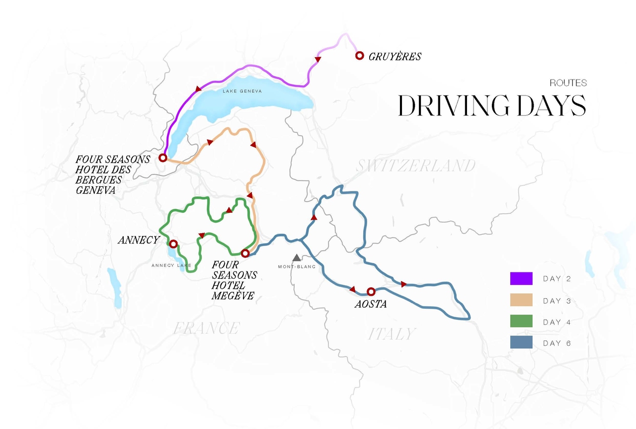 Nos dias seguintes o destino é o vilarejo de Megève, com paradas no caminho para aprender o processo da arte atemporal da relojoaria, e visita ao icônico Chateau d'Avully. A hospedagem será no Four Seasons Hotel Megève, um chalé alpino moderno assinado pela família Rothschild, com gastronomia premiada e estrutura tanto para a temporada de neve como para o verão.