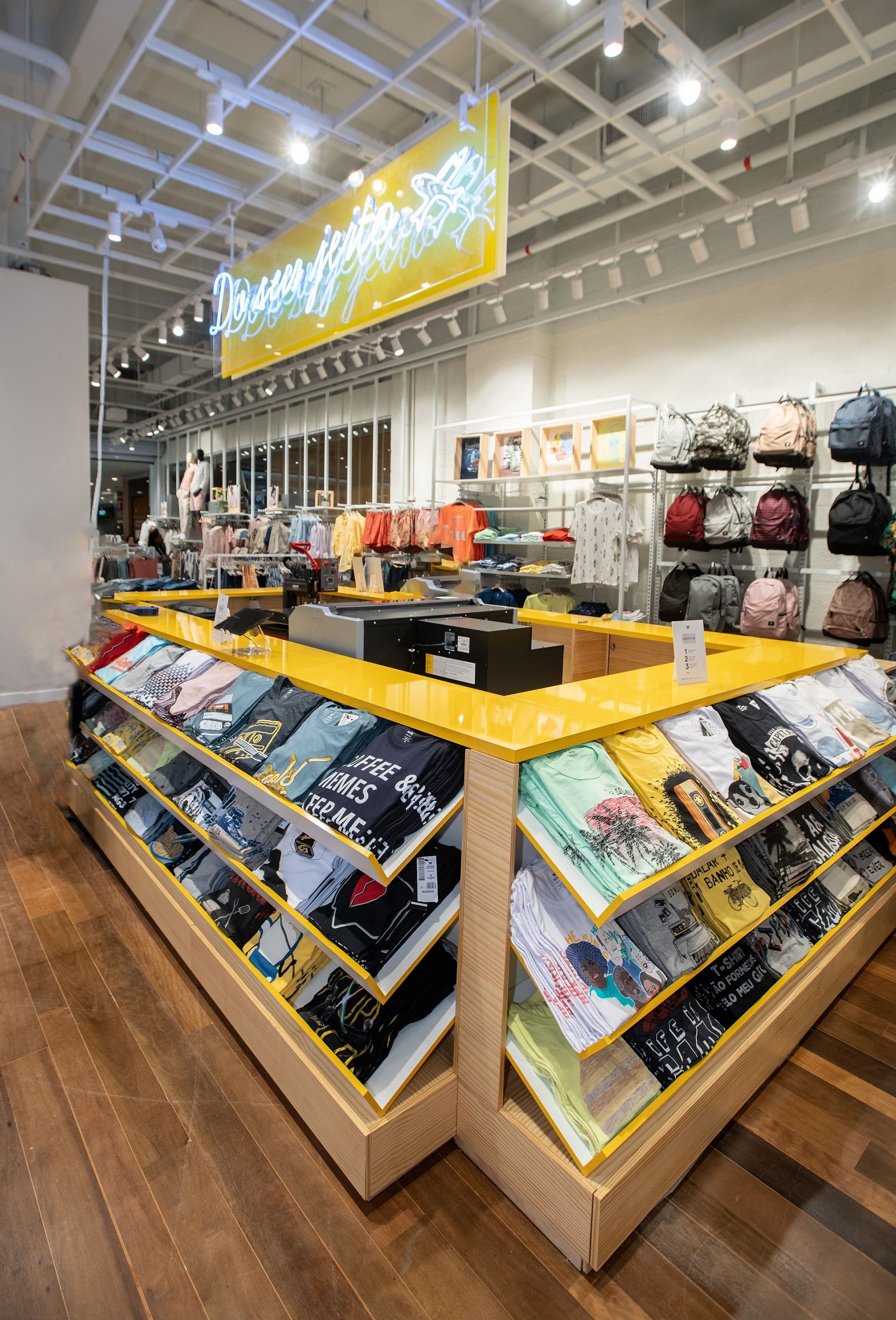 Na segunda metade da loja, são reservados espaços para as linhas Kids – onde as crianças podem se divertir em um cantinho de brincadeiras –, underwear, intimates e pets. Próximos aos caixas estão produtos de papelaria e demais itens presenteáveis.