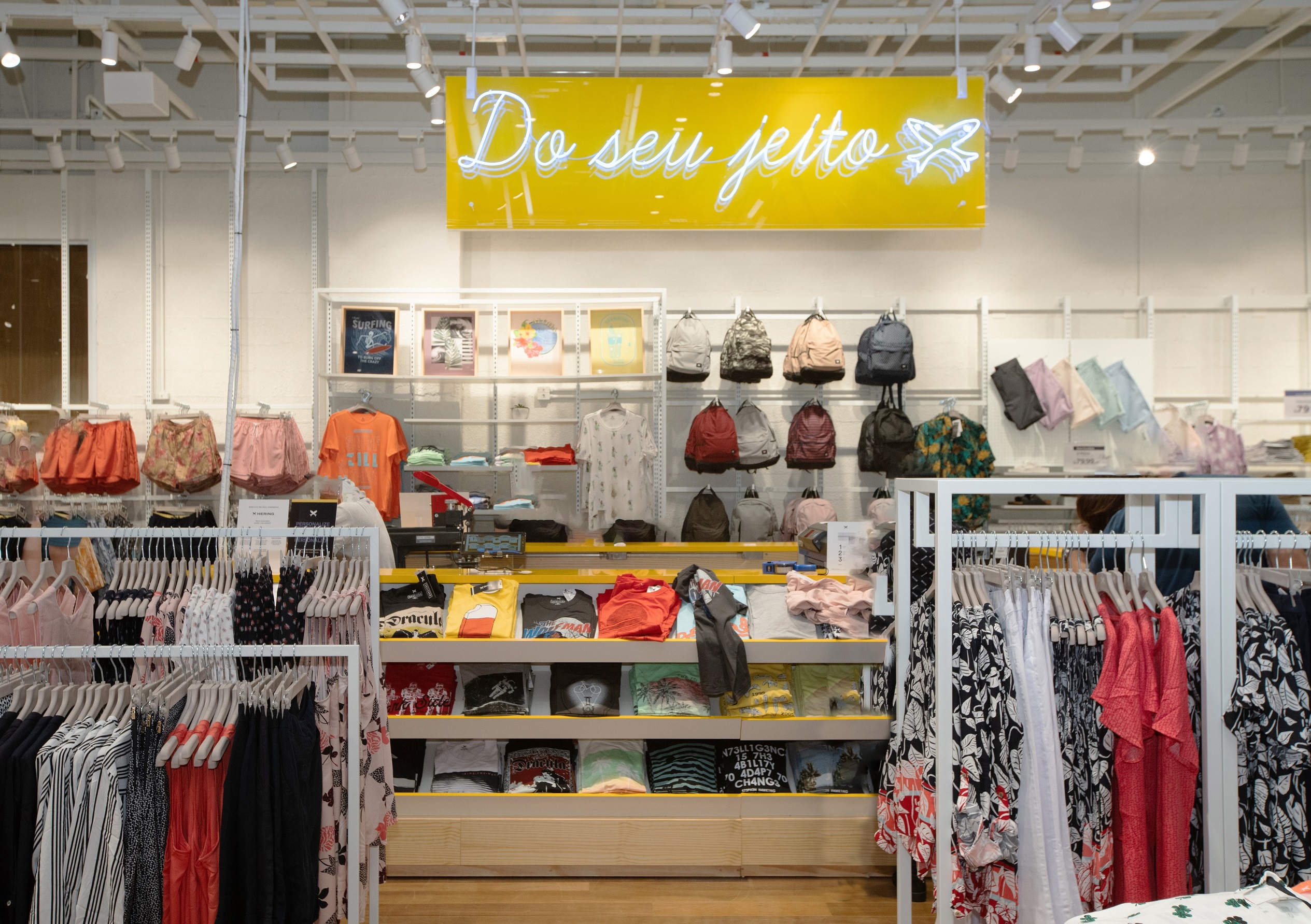 Além de trabalhar o básico como lifestyle e trazer informação de moda, o portfólio da loja é composto por itens proprietários da Hering e complementado por produtos de outras marcas que têm sinergia com a Hering e agregam à jornada de compra do visitante. Maiôs, biquinis, sandálias, itens de papelaria, garrafas térmicas e copos estilosos fazem parte do mix de produtos.