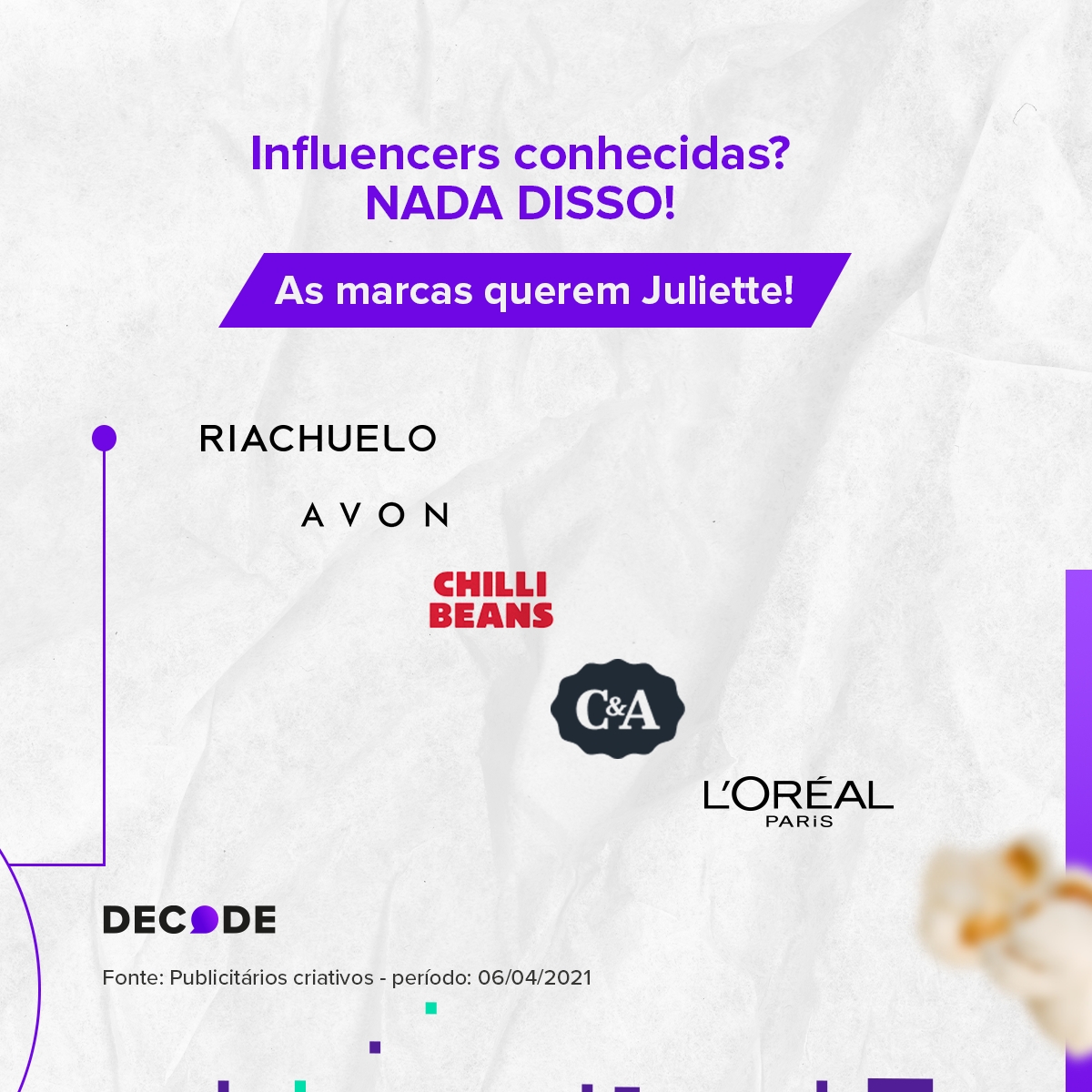 E não para por aí! As menções à Juliette não ficam apenas nas redes sociais, como os mais de 95 mil tweets comentando suas maquiagens, não. Mais de 12 mil matérias jornalísticas foram lançadas sobre ela e o alcance estimado foi em torno de 13 milhões de pessoas até março. A enorme repercussão também chamou a atenção de grandes marcas como Riachuelo, Avon, Chilli Beans, C&A e L’oreal Paris, que já afirmaram querer a BBB em seus publis e campanhas. Mais recentemente, a Oral-B também manifestou interesse após a maquiadora utilizar uma escova de dentes para aplicar uma técnica de maquiagem.