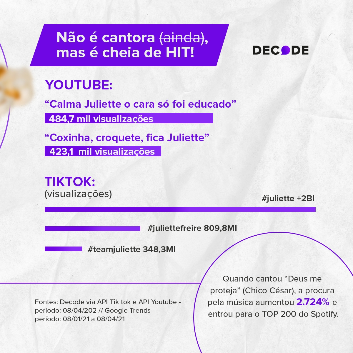 Até as músicas que ela canta para espantar o tédio do confinamento acabam ganhando uma proporção gigantesca aqui no mundo exterior. As principais buscas relacionadas a seu nome no Google foram “música Juliette bbb” e “juliette cantando”. A canção “Deus me Proteja”, de Chico César cantanda por Ju, teve um aumento de 2.724% nas buscas nos últimos 3 meses e, além disso, entrou para o Top 200 do Spotify na mesma semana.