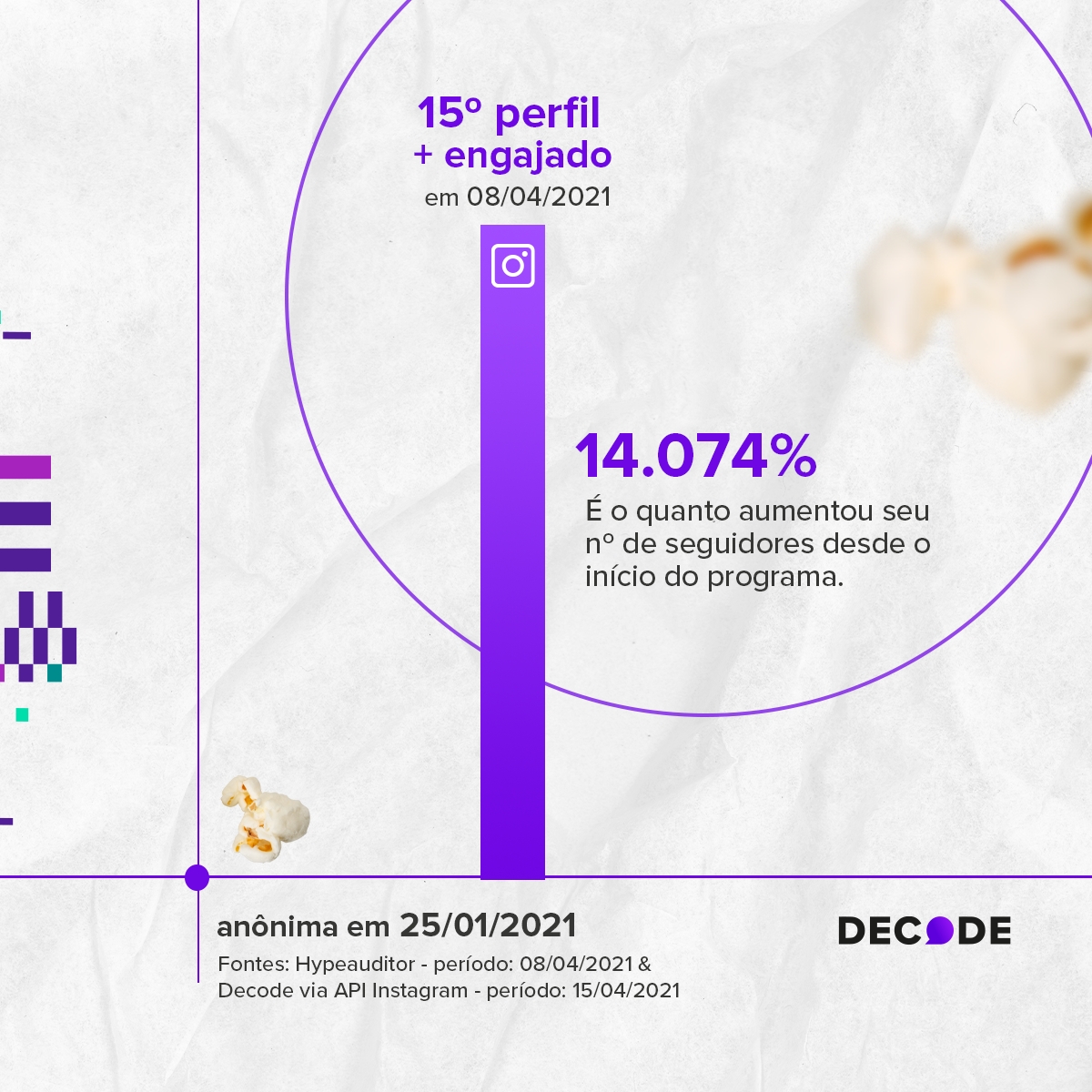 O crescimento dos perfis que seguem a participante equivale a 14.074% entre o início do programa e o dia 15.04.2021, já que, em 25.01.2021, Juliette era seguida por, aproximadamente, 3 mil pessoas na rede social de fotos. Enquanto isso, Viih Tube, a BBB que detinha o maior número de seguidores antes de entrar na casa, teve um aumento de apenas 13% nesses quase 3 meses de programa.