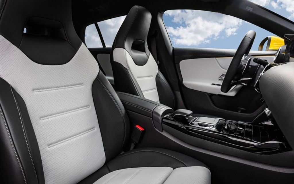 O mesmo conceito segue no interior do automóvel. Os bancos AMG Performance revelam o formato em concha, com acabamento em couro sintético ARTICO com microfibra DINAMICA em cor preta com costuras contrastantes. Da mesma forma que o volante AMG de base achatada que reforçam a esportividade do interior.
